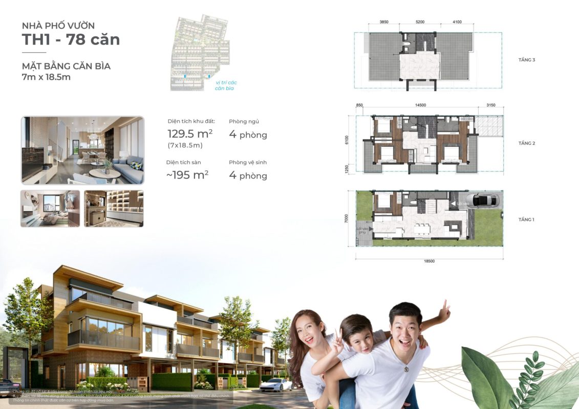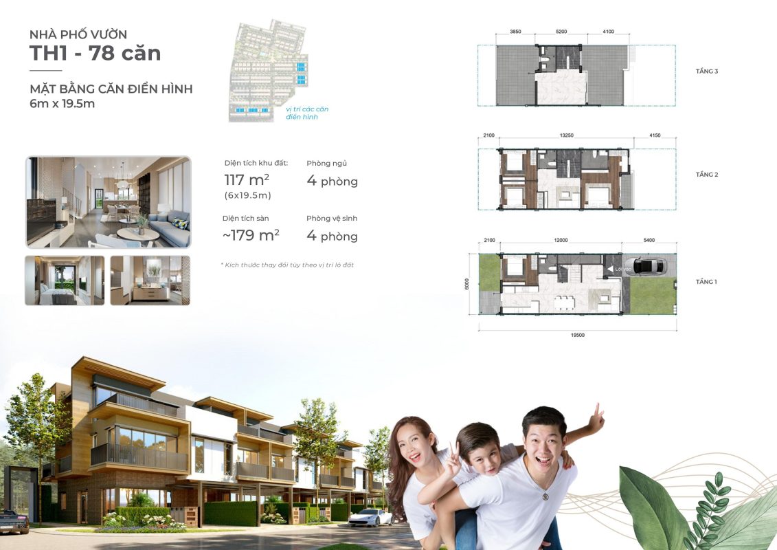 • Nhà phố TH1 Mẫu điển hình: 117 m2 đất, 179 m2 sàn, 3 tầng.