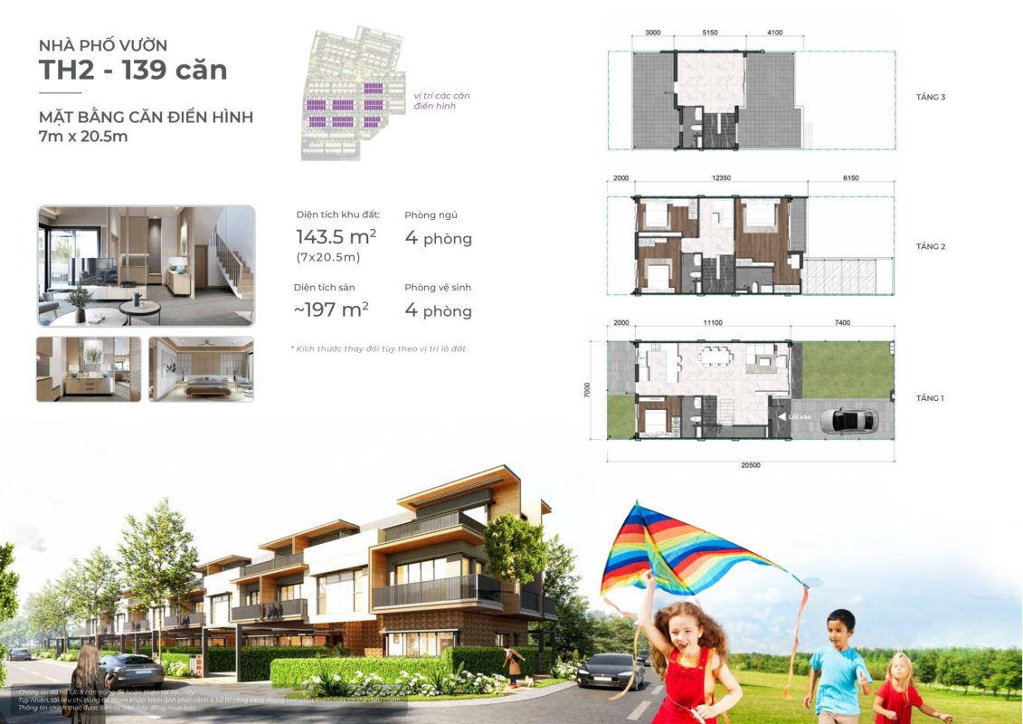 • Nhà phố TH2 Điển hình: 143,5 m2 đất, 197 m2 sàn, 3 tầng.