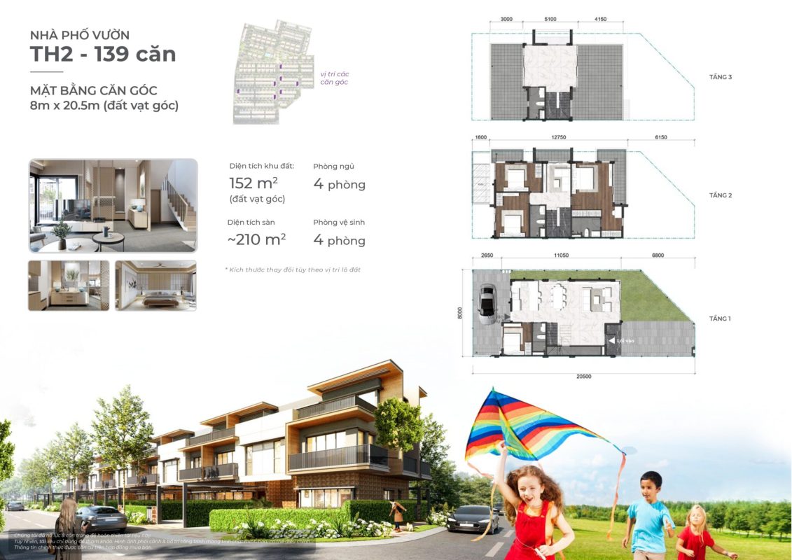 • Nhà phố TH2 Căn góc: 152 m2 đất, 210 m2 sàn, 3 tầng.