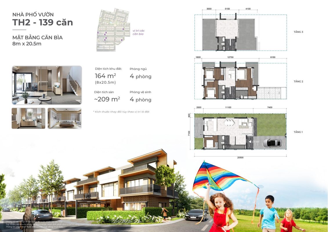 • Nhà phố TH2 Căn bìa: 164 m2 đất, 209 m2 sàn, 3 tầng.