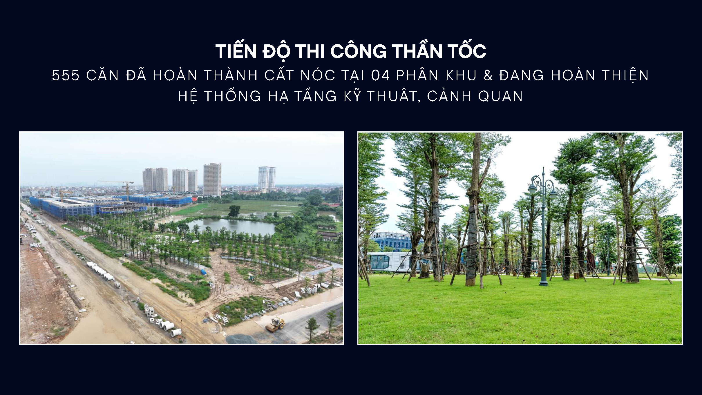 đang tăng tốc thi công, diện mạo khu đô thị dần hoàn thiện rõ nét. Hiện hơn 1.200 căn nhà phố đã cất nóc, nhiều căn đang được trát tường, lắp lan can nghệ thuật và hoàn thiện mặt ngoài theo phong cách châu Âu cổ điển. Hạ tầng giao thông nội khu được lát đá, trồng cây xanh đồng bộ, tạo cảnh quan xanh – sạch – sang trọng. Công viên trung tâm 1,6ha đã hoàn thiện kè đá, đường dạo, sân đường và chòi nghỉ gỗ. Song song, hệ thống điện, thoát nước, chiếu sáng và đường nối Hoàng Quốc Việt kéo dài cũng được đẩy nhanh tiến độ. Mọi hạng mục đều được giám sát nghiêm ngặt, hướng tới chuẩn mực đô thị hàng hiệu bậc nhất phía Tây Thủ đô.